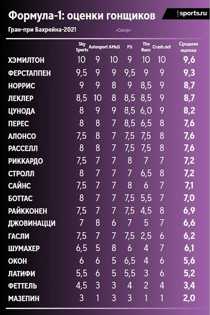 Журналисты ведущих европейских изданий выставили оценки гонщикам «Формулы-1» за выступления на Гран-при Бахрейна, где прошло открытие сезона-2021.