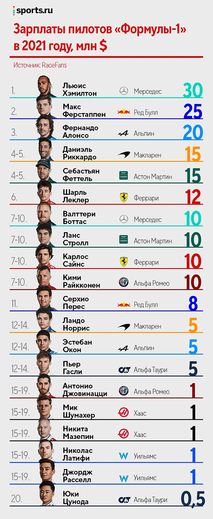 Не стоит удивляться обилию контрактов в $1 млн. Мик Шумахер только-только пришел в «Формулу-1», и было бы странно видеть крупный контракт для немца в «Хаасе» даже несмотря на громкую фамилию. К тому же, контракт Мика запросто может регулироваться «Феррари» за счет участия в молодежной программе. Примерно такая же ситуация у Джорджа Расселла и Юки Цуноды: японец, судя по всему, подписал стандартную пятилетнюю сделку с «Ред Булл», по которой основа гонорара – бонусы за очки и победы (ну вдруг!).