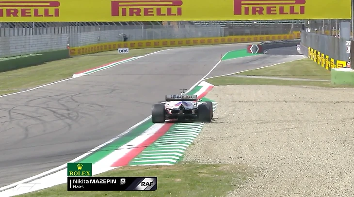 Что ж, на сей раз Мазепин сдержал слово и не выдал слишком резкий газ на поребрике. Но допустил другую типичную ошибку не слишком разумного новичка – вывалился колесом за пределы асфальта и/или бетонового покрытия, расширяющего трек.