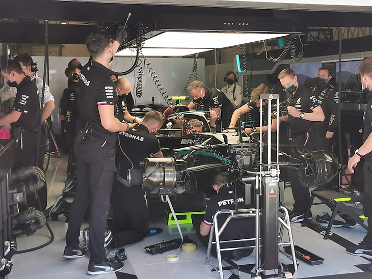 16:55 Ой-ей. Проблемы с одним из сенсоров в силовой установке на болиде Боттаса! До старта сессии чуть больше пяти минут, механики лихорадочно работают с машиной.