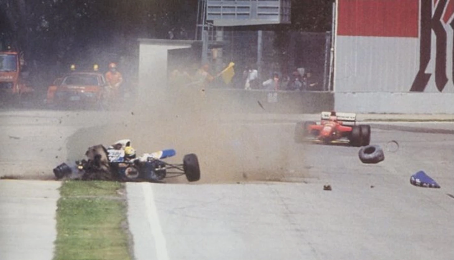 На старте гонки болид финна Юрки Ярвилехто заглох и в него, набирая скорость, врезался Педру Лами (при этом разлетевшимися обломками были ранены трое зрителей, один из них тяжело), и на трассу выпустили машину безопасности, чтобы скорость движения болидов снизилась и можно было убрать обломки. Гонщики ехали за машиной безопасности до 6-го круга. На 7-м круге, втором после ухода машины безопасности и рестарта гонки, машина Сенны сорвалась с трассы в повороте «Тамбурелло» и на огромной скорости врезалась в бетонную стену. Согласно показаниям телеметрии, в момент срыва скорость машины была около 310 километров в час, после этого Сенна успел затормозить и замедлить машину, но всё же скорость в момент удара о стену составляла примерно 211 км/ч.