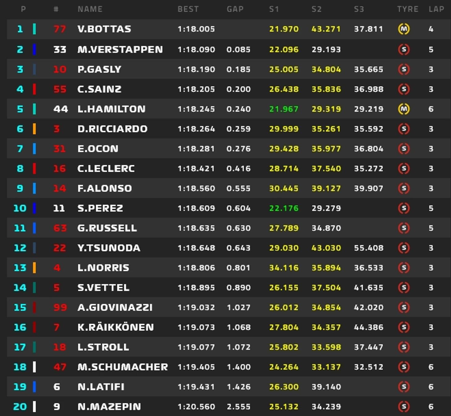 16:16 Боттас и Хэмилтон в первых попытках едут на «медиуме». Ферстаппен – на «софте».