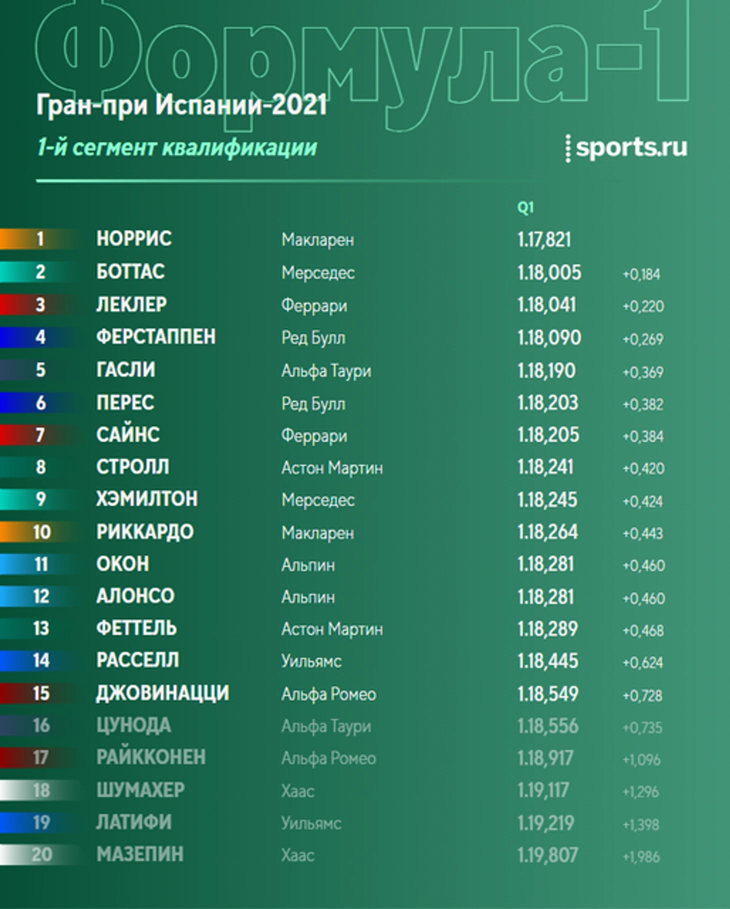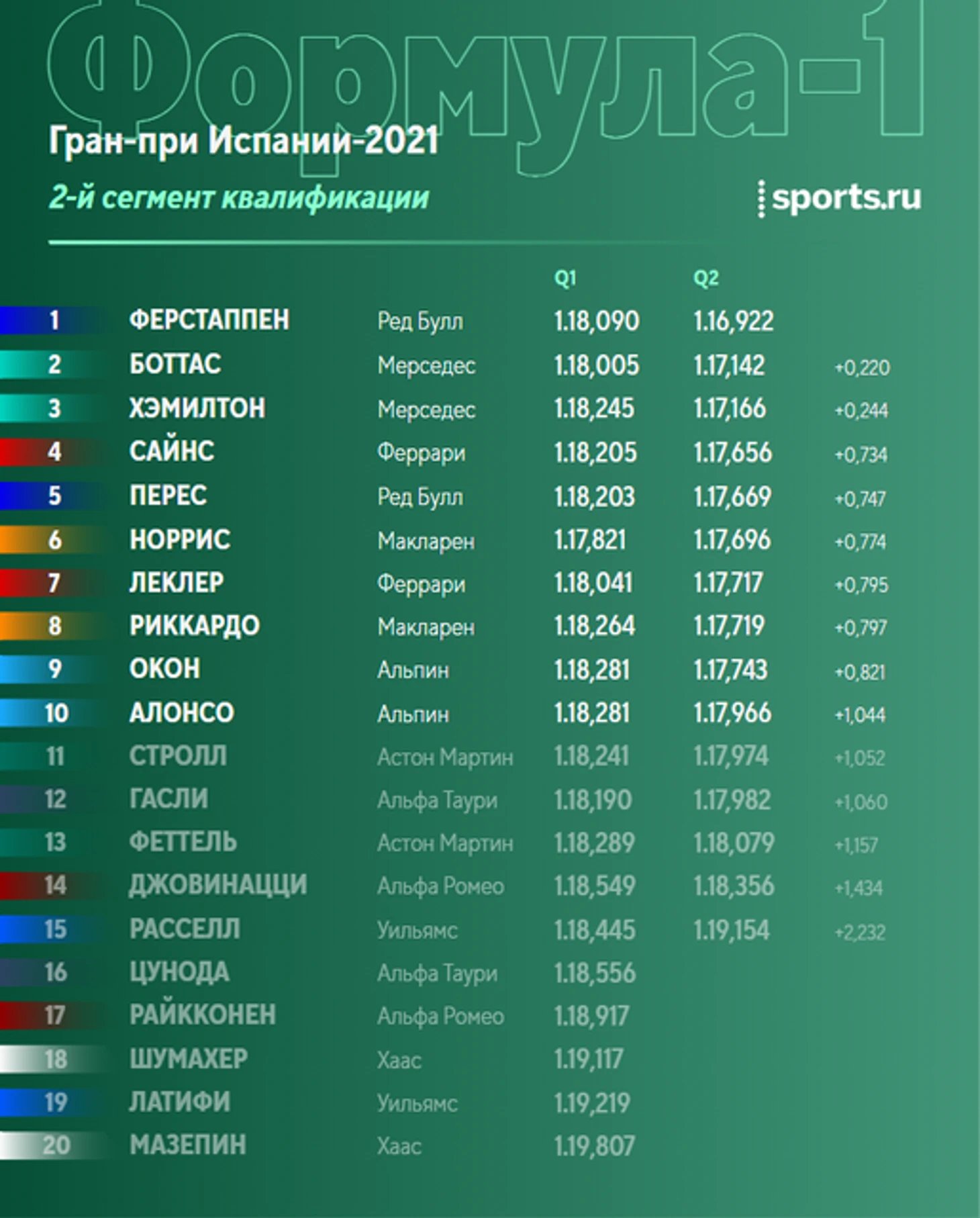 16:50 Уже после клетчатого флага кое-кому удалось улучшить свои времена – Сайнс стал 4-м, Перес – 5-м. Феттель не прошел в третий сегмент, а вот Алонсо стал 10-м.