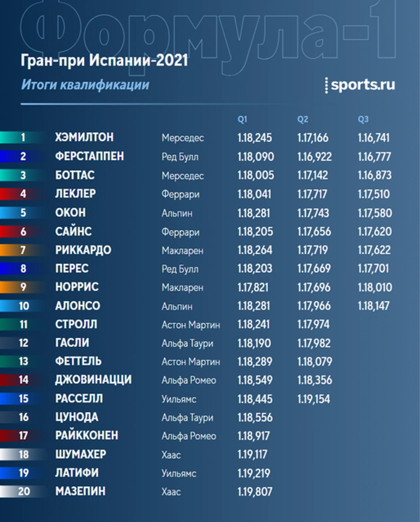Хэмилтон выиграл поул в Испании, Ферстаппен – второй, Мазепин – последний