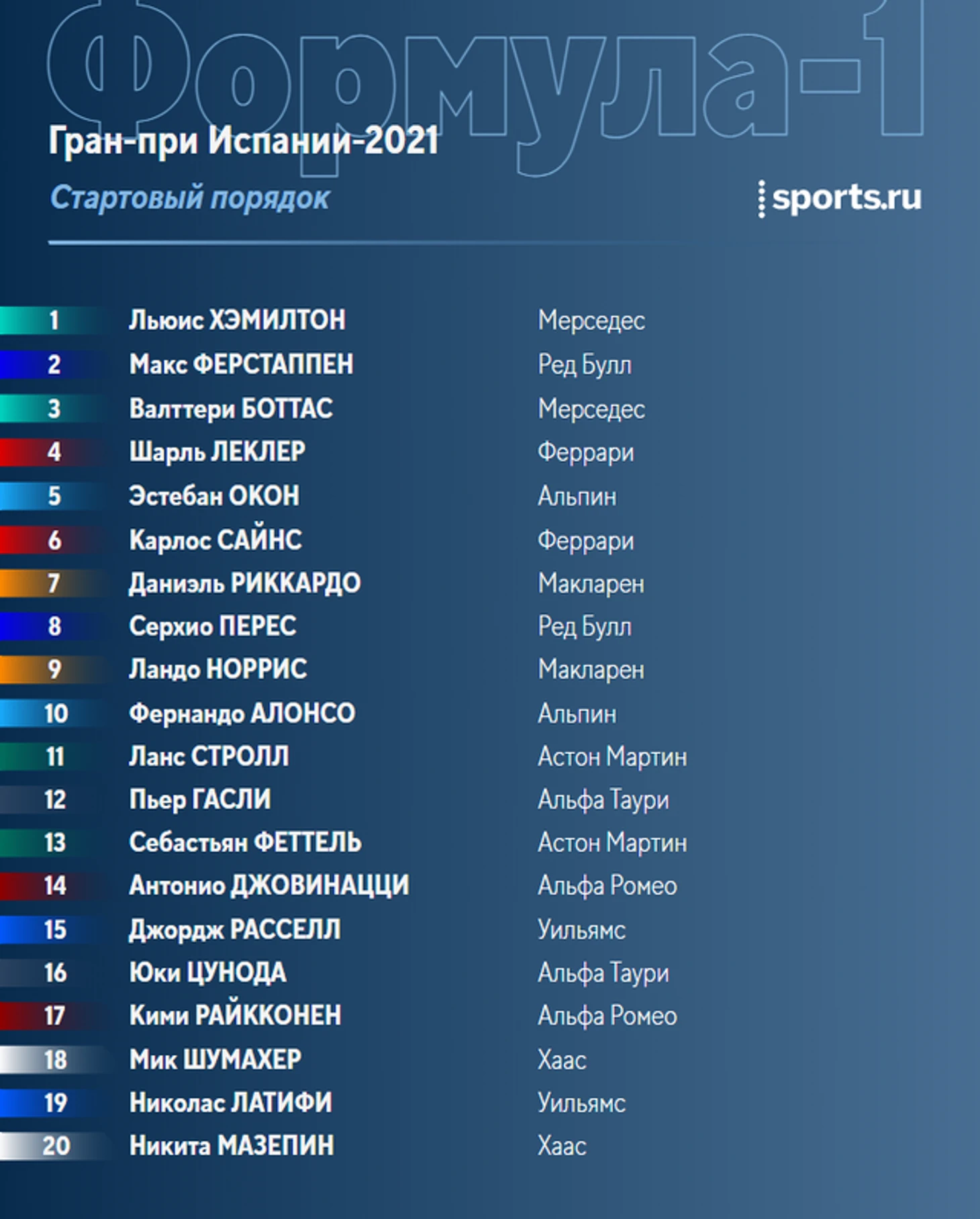 Боттас тоже совсем рядом, а в Испании старт – чуть ли не единственная возможность отыграть позиции непосредственно на трассе. И при довольно длинном рывке к первому повороту (600 метров), у финна может появиться шанс воспользоваться слипстримом. А вот Серхио Перес вряд ли сумеет сразу помочь Ферстаппену в борьбе с двумя «Мерседесами» – Чеко провалил квалификацию и стартует лишь восьмым.