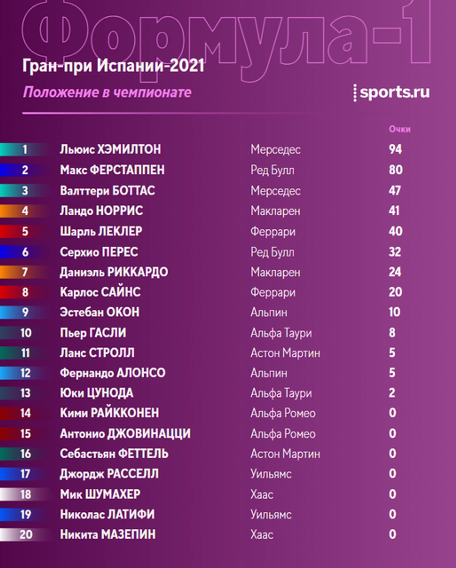 Также есть изменения в конце топ-10 – Стролл обогнал Алонсо в борьбе за последнее место в очковой зоне.