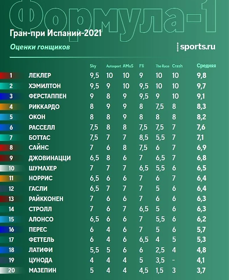 Журналисты ведущих европейских изданий выставили оценки гонщикам «Формулы-1» за выступления на Гран-при Испании – четвертом этапе сезона-2021. В этот раз медиа выше всех оценили выступления одержавшего победу Льюиса Хэмилтона и завершившего гонку четвертым Шарля Леклера.