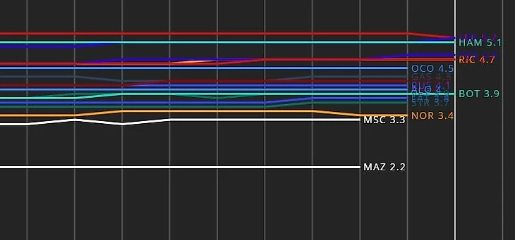 Даже на «Барселоне-Каталонии» (знакомой для всех трассе, где плотная борьба) показатели Мазепина выглядят катастрофой: низкая скорость прохождения виражей, медленные разгоны на прямых и недостаточно быстрый сброс скорости в зонах торможений.
