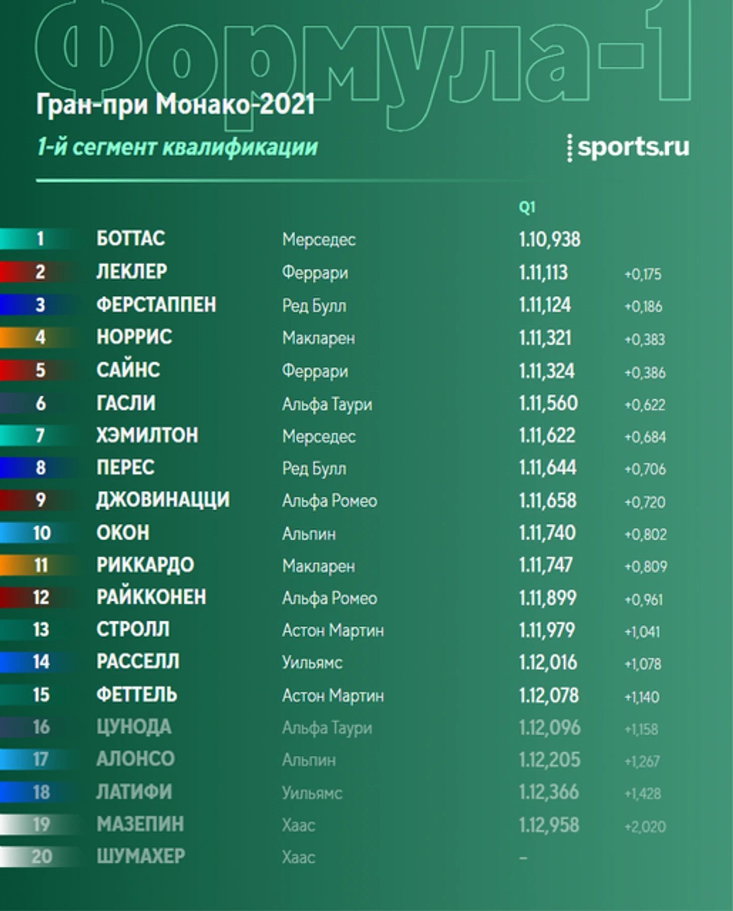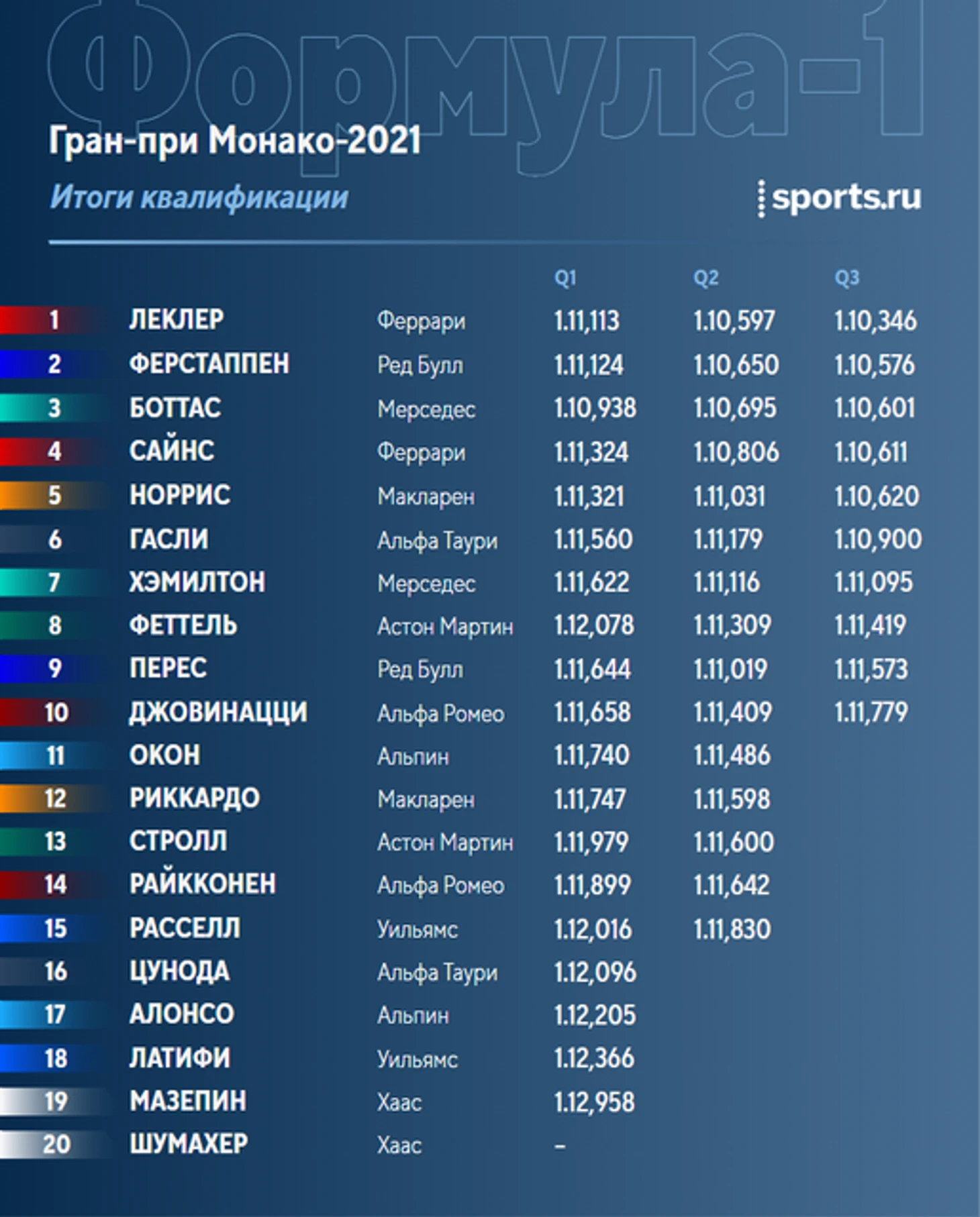 Окончательные итоги сессии: Леклер (пока) стартует с поула. Рядом с ним – Ферстаппен. На втором ряду тоже интересно – у Боттаса и Сайнса будет шанс на старте. Хэмилтон – лишь 7-й. Крайне интересно, как в «Мерседесе» будут выпутываться из сложившейся ситуации на самой не обгонной трассе чемпионата. Так что завтра ожидается крайне интересный заезд – до встречи!