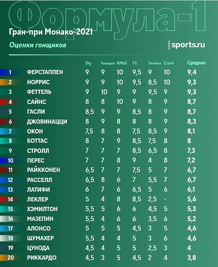 Журналисты ведущих европейских изданий выставили оценки гонщикам «Формулы-1» за выступления на Гран-при Монако – пятом этапе сезона-2021. В этот раз медиа выше всех оценили трех пилотов – Макса Ферстаппена, Ландо Норриса и Себастьяна Феттеля.