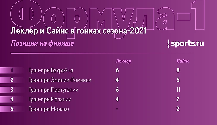 После серьезного отставания в Бахрейне и вылета после второго сегмента в Имоле Сайнс обыграл партнера по Скудерии в Португалии, был чуть медленнее на родине, а в Монте-Карло не смог проехать быстрейшую попытку из-за аварии Леклера.