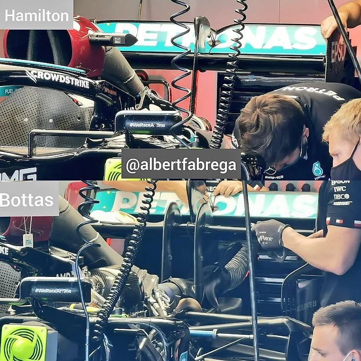 Наработки из практик перекочевали в квалификацию: Хэмилтон получил экстремальную версию нового антикрыла – с минимальной пластиной для снижения лобового сопротивления и повышения скорости на прямых (теоретически оно тоже должно гнуться). Боттасу же отдали более традиционную и устойчивую версию на двух пилонах и с большей пластиной – болид №77 теоретически должен был прибавить в поворотах, но сдать на прямых.