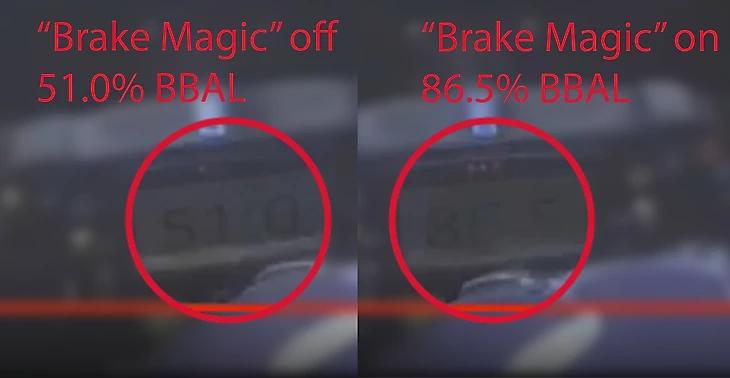 В гоночных условиях баланс тормозов близок к нейтральному, а в поворотах пилоты смещают его на 1-2 процента вперед (к примеру, в шпильках) или назад (в затяжных изгибах трассы). Разумеется, неожиданный скачок баланса на 30 пунктов мог завершиться лишь поездкой в зону безопасности.