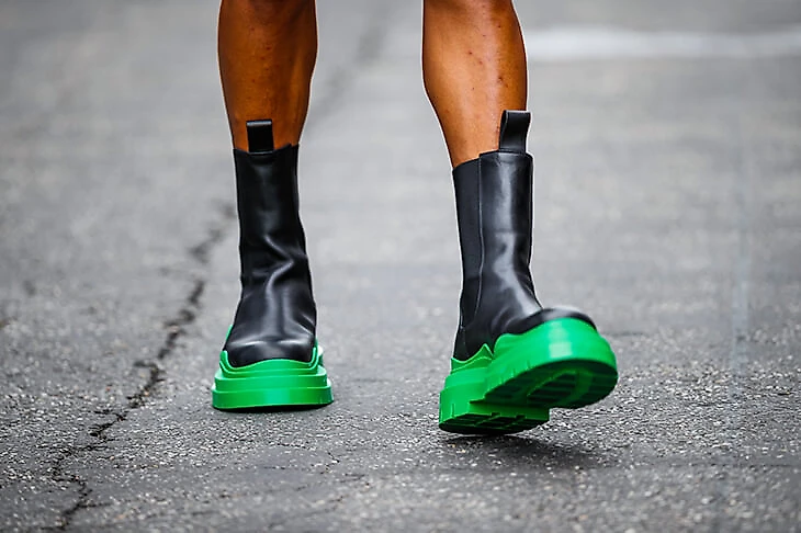 Практически обтягивающая худи, черный оверсайз-пиджак, шорты – прекрасный набор! Но гвоздем лука оказались массивные кожаные сапоги с резиновой высокой подошвой цвета «травы» от итальянского люксового бренда Bottega Veneta стоимостью 1200$.