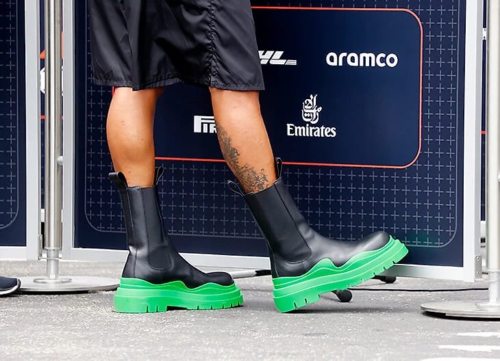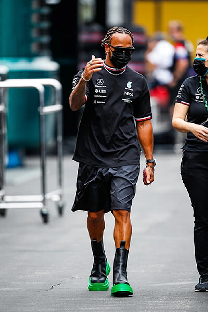 Новый наряд Хэмилтона на Гран-при – чистый мазохизм: здоровенные зеленые кожаные сапоги за $1200 по 28-градусной жаре