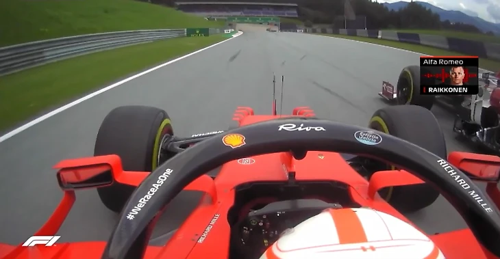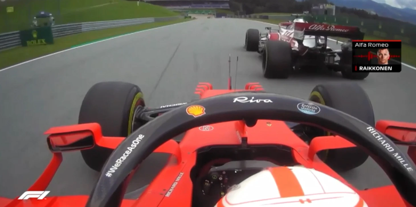 Но Леклер все равно не успокоился – более того, выкрутил тумблер агрессии за пределы любого максимума. К примеру, вот его наскок на Кими Райкконена: повернул на прямой чуть раньше для обороны свежеотобранной позиции и снес Айсмену кусок антикрыла – еще повезло поехать дальше без проколов.