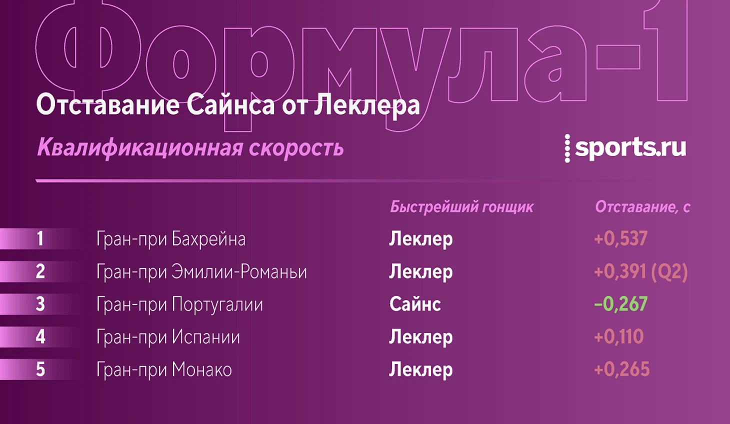 В итоге по чистому темпу в квалификации Леклер переигрывает Сайнса.