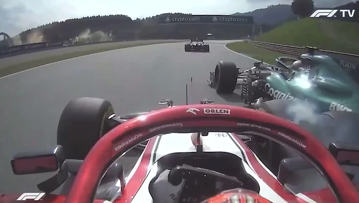 Кими попытался удержать более выгодную линию для следующего левого поворота – и постарался перекрыть ее Себу. Однако Феттель уже формально оказался впереди на ровном отрезке и закономерно счел своим право диктовать траекторию – так что пилот «Астон Мартин» сам попытался оттеснить соперника. Итог – совместный вылет в гравий.