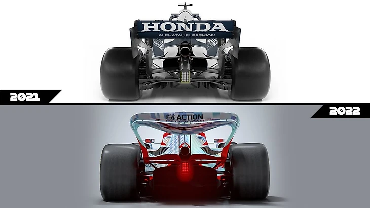 Визуально заднее антикрыло 2022 года сильно отличается с его верхними концевыми пластинами вместо прямых концевых пластин и дополнительными нижними элементами. Новая конструкция специально разработана для того, чтобы аэродинамический след (поток воздуха, выходящий из машины) поднимался вверх и проходил над следующим автомобилем, а не прямо в него - фактор, который затруднял гонщикам преследование в нынешнюю эпоху.