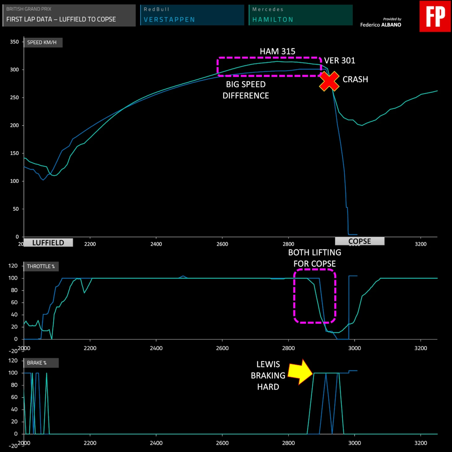 Нужно иметь в виду свойство поворота: кто-то может заметить, будто перед виражом и так принято сбрасывать и тормозить, но «Копс» – очень скоростной изгиб. Перед ним обычно машины не замедляются, а ногу с педали газа снимают только при высокой топливной загрузке – тут как раз такой случай. Для сравнения: Ферстаппен вообще надавил на тормоз только после контакта.