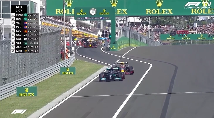 Но, похоже, реальной уверенности в машине у Льюиса не было. №44 завершил первую попытку решающего сегмента с преимуществом в 0,5 секунды над Максом, но даже на остывающем треке (обычно с падением температур асфальта снижается и шанс на улучшение времени) семикратный чемпион решил сыграть на границе правил – и слегка замедлился перед ребятами из «Ред Булл» на пит-лейн.