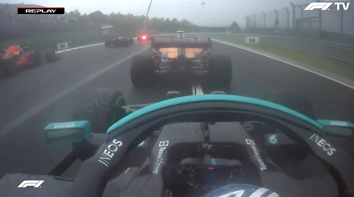 Боттас провалил дождевой старт – и вынес оба «Ред Булл» в первом же повороте. Прихватив еще и «Макларен»