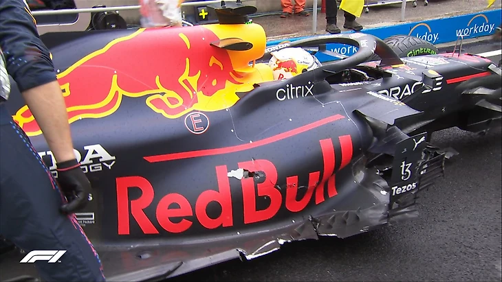 Но страйк удался: Перес и Норрис сошли, а болид Ферстаппена остался фактически без половины аэродинамического обвеса и откатился в хвост пелотона (13-е место на момент красных флагов).