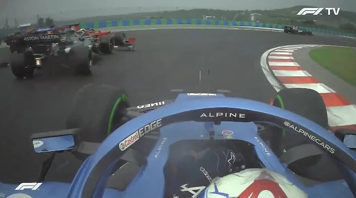 Перед самым поворотом Эстебан интуитивно освободил внутреннюю траекторию и сместился чуть ближе к центру трека, чтобы попытаться что-нибудь выгадать в борьбе с притормозившим Леклером.