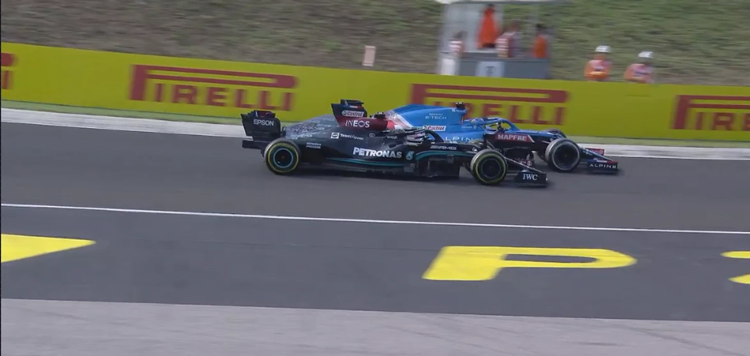 Сдвинься №14 хоть чуть-чуть левее в сторону внутренней траектории – Льюис легко объехал бы его на выходе из виража. А если бы Алонсо остался на гоночной траектории (где сейчас «Мерседес») – Хэмилтон бы просто нырнул на внутреннюю и выиграл бы точку торможения за счет более свежих шин.