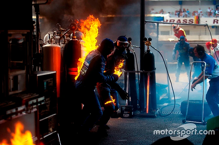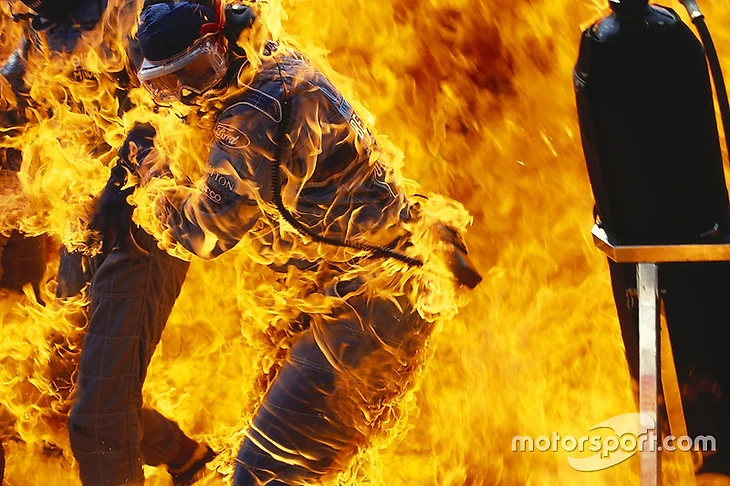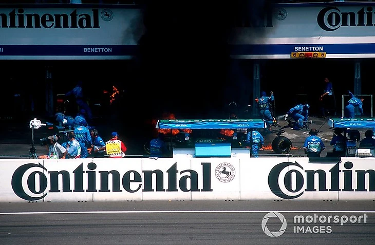 Самый обычный пит-стоп гонщика Benetton Йоса Ферстаппена превратился в настоящий ад, когда топливо начало выливаться из шланга и загораться на поверхности горячей машины. Это все было показано по ТВ в прямом эфире, а еще больше драмы моменту добавил кадр, в котором механик Benetton Пол Сиби полностью охвачен огнем и пытается отбежать от машины.