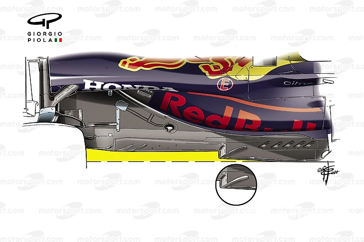 Ред Булл одной из первых внедрила Z-образную кромку днища, а также однозначно входит в число лидеров по темпам доработок машины в течение сезона. Практически на каждую гонку они привозят какие-то новинки.