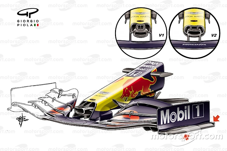 О каких именно просчетах с RB16 идет речь? Ньюи, разумеется, не стал вдаваться в детали, но можно вспомнить, как в начале 2020-го команде пришлось отказаться от носового обтекателя с более узкими пилонами (V2 на иллюстрации) и вернуться к базовой конфигурации.