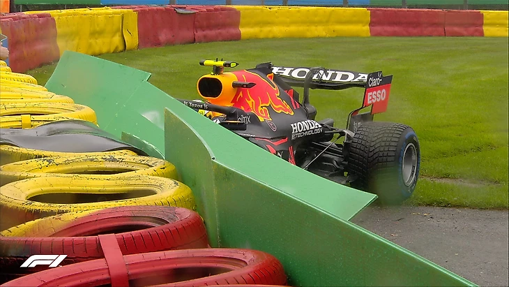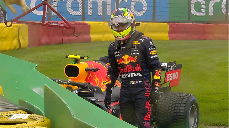 Ой-ей! Команда сказала Пересу заглушить двигатель – это конец, Чеко не выступит на Гран-при Бельгии! В столкновении с барьерами была повреждена передняя правая подвеска – такие повреждения невозможно устранить за 25 минут.