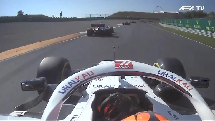Мазепин изначально стартовал не слишком убедительно, но сумел сесть на хвост напарнику, выждал несколько поворотов и нашел удачный момент для атаки: отвоевал позицию по внутренней траектории.