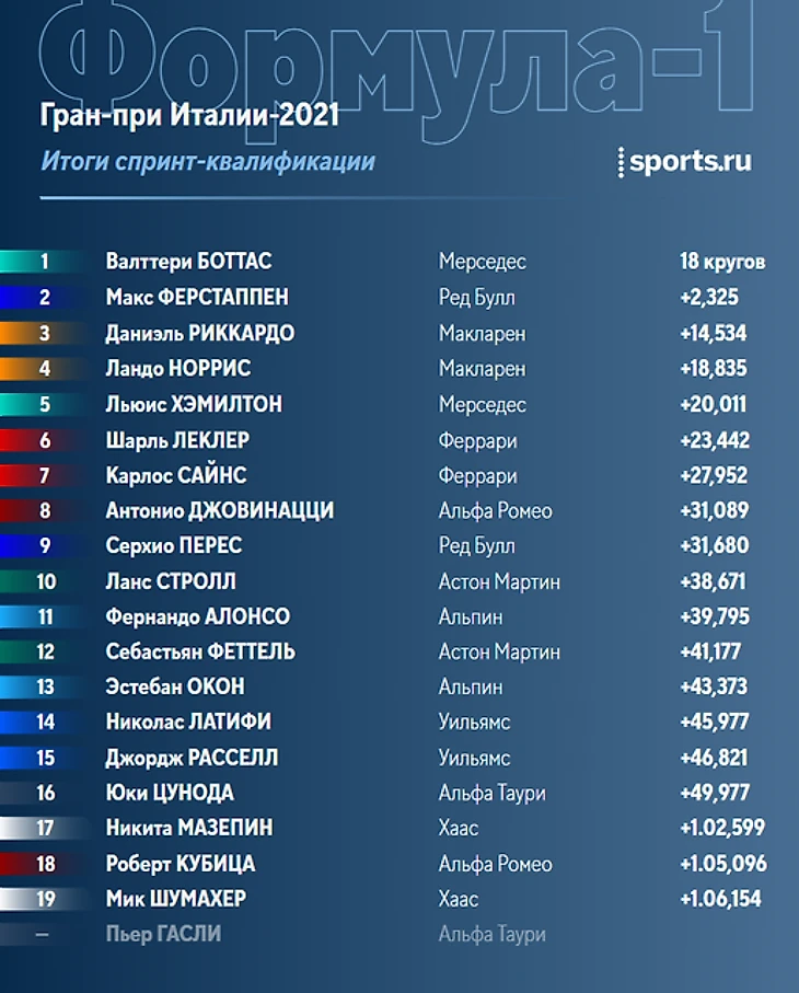 17:20 Если вы вдруг решили, что Валттери Боттасу дадут возможность сегодня побороться за первое место (которое, впрочем, все равно не поможет финну – его ждет штраф и старт в воскресной гонке с последней позиции), то зря – босс «Мерседеса» Тото Вольфф пояснил, что если спринт будет идти гладко и Валттери будет ехать впереди ЛЬюиса Хэмилтона – пилотов попросят поменяться местами.