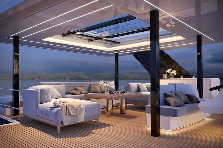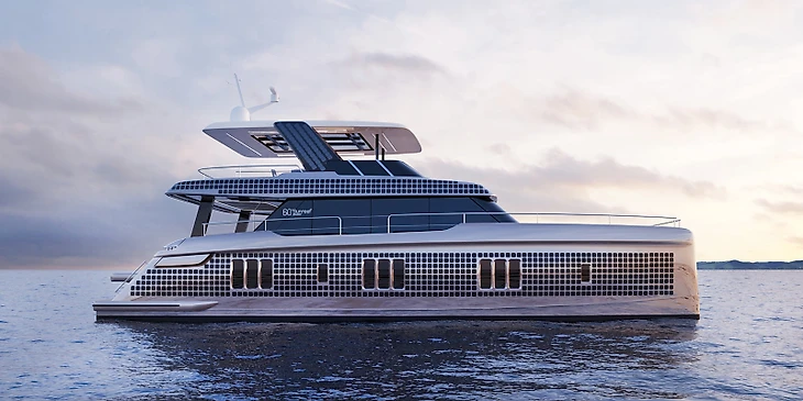 Но главная фишка – даже не в обстановке, а в ее покрытии: яхта полностью заключена в «солнечную кожу» из панелей-генераторов (перерабатывают 25 процентов тепловой энергии – лучше на рынке пока нет). Пиковая выработка электричества достигает 14 кВт*ч – и ее можно накапливать в инновационных сверхлегких аккумуляторах емкостью 320 кВт (масса всего в 5,2 кг на 1 кВт – на 30 процентов меньше, чем у конкурентов по рынку). По заявлениям производителя, полного заряда хватит на двое полных суток кондиционирования всей яхты и жизни в режиме обычного дома без подзаряда, а в солнечную погоду при соответствующем ограничении скорости можно плавать на электромотрах фактически бесконечно. А сидит все это великолепие на корпусе из углеродного волокна – как на болиде «Ф-1».