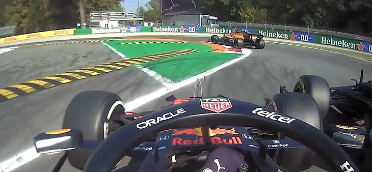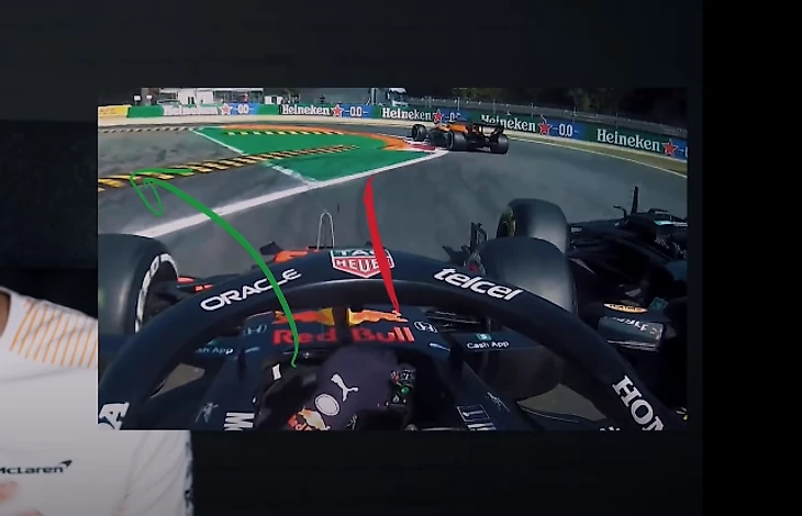 Но и Ферстаппен не нарушал регламент и не рулил откровенно в соперника. Более того, он и не выехал полностью за пределы трека: как видите, два колеса все еще справа, за белой линией: