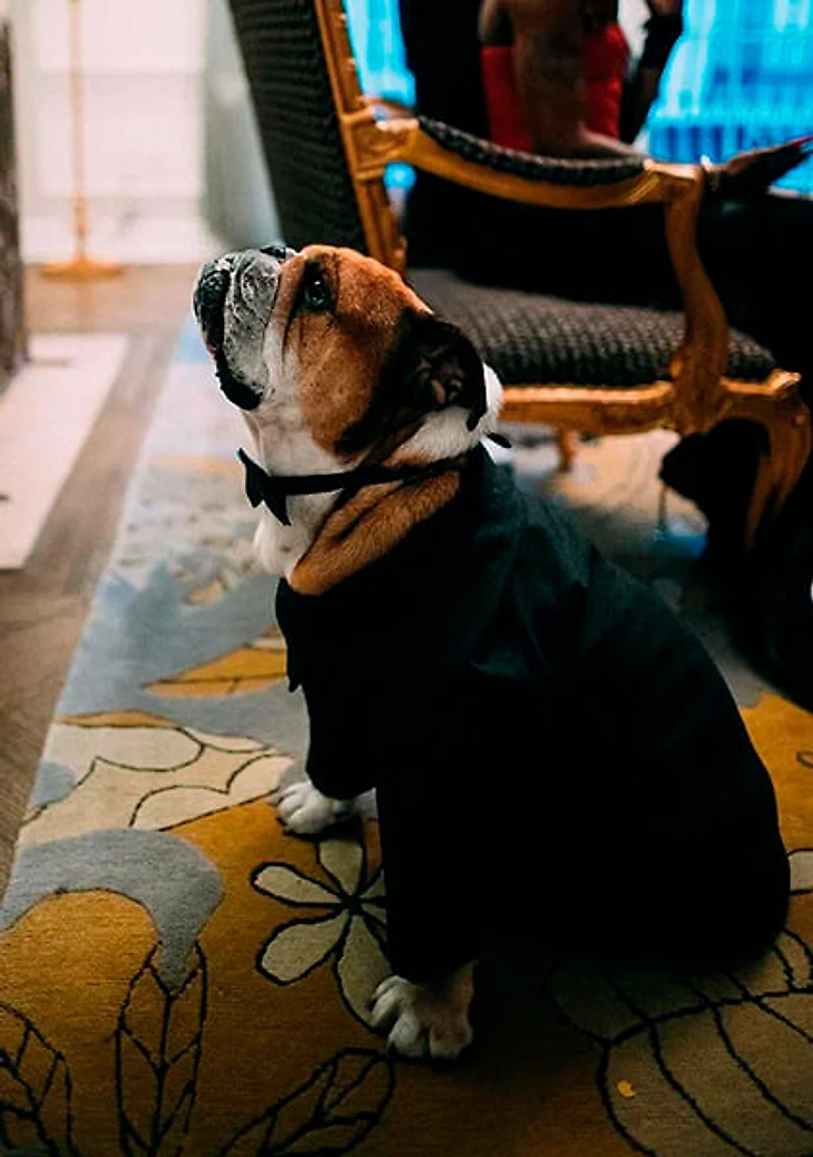 Бульдог пилота Роско тоже принарядился к светской тусовке в роскошном костюме.