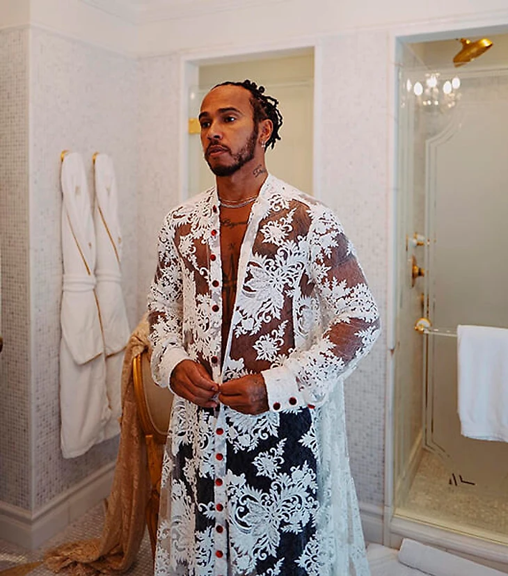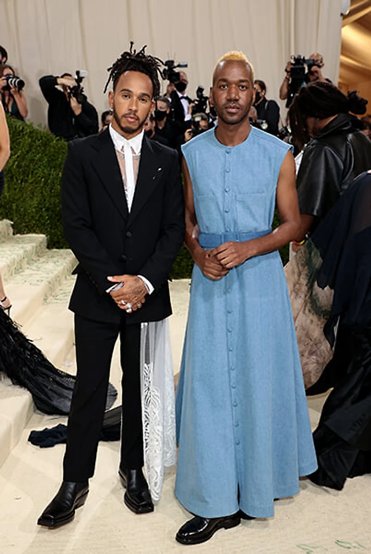 Семикратный чемпион «Формулы-1» – постоянный гость мероприятия с 2015 года. Обычно Хэмилтон предпочитал наряды известных кутюрье, но теперь не просто надел наряд начинающего модельера, но и выкупил стол для трех молодых темнокожих дизайнеров: Теофилио, Кеннета Николсона и Джейсона Ремберта.