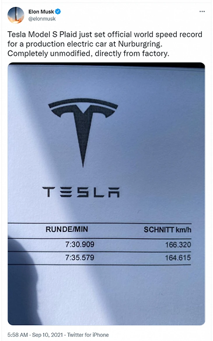 Но, похоже, теперь все изменится: ведь новая «Тесла» Model S в максимальной модификации Plaid побила рекорд для серийных электрокаров на «Северной петле Нюрбургринга» – одном из самых старых, олдскульных и смертельных треков Германии и мира (именно там чуть заживо не сгорел Ники Лауда в аварии 1976-го). Американская машина проехала круг за 7.30,909 – на 13 секунд улучшив время «Порше» Taycan Turbo (у него – 7.43,3).