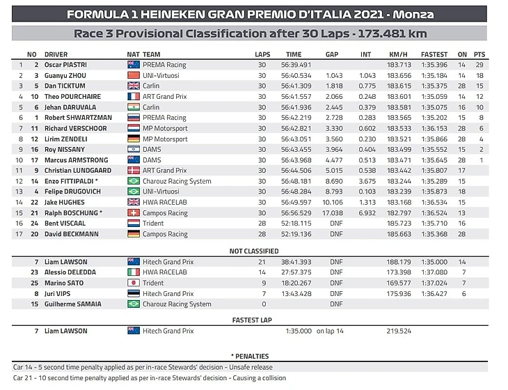 Подводя итог Гран - При Италии, мы замечаем, что Оскар только укрепляет свою лидирующую позицию в личном чемпионате. Все изменения вы можете увидеть ниже: