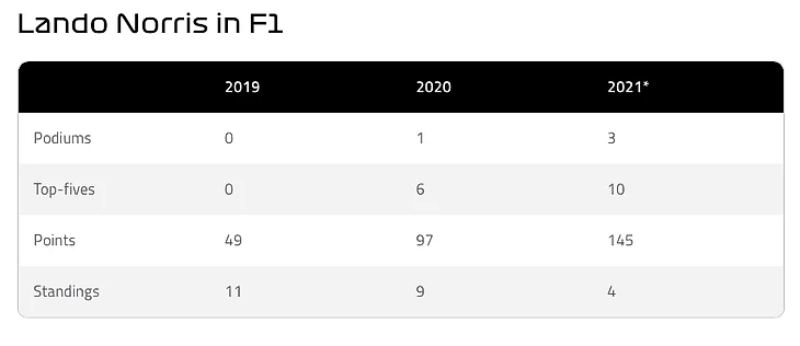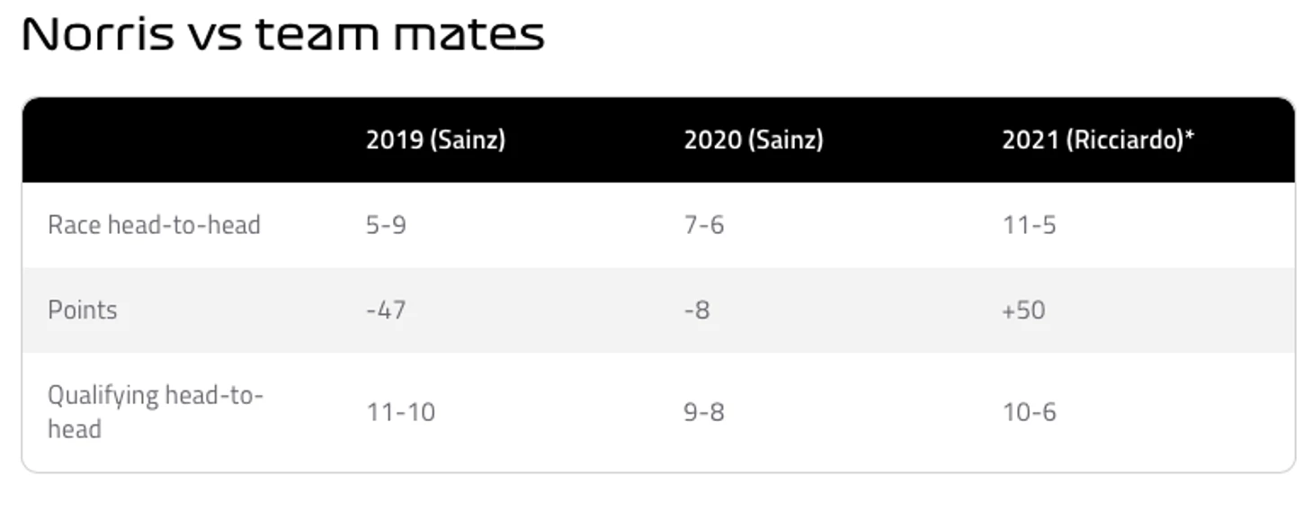 Взлет Норриса был быстрым. Его дебютный сезон в Ф-1 был очень уверенным, ведь британец впечатлил с самого начала, заняв 6 место уже в своей второй гонке и, несмотря на то, что более опытный напарник Карлос Сайнс был впереди по количеству очков за сезон, Ландо сумел вырвать победу в квалификационном счете 11-10.