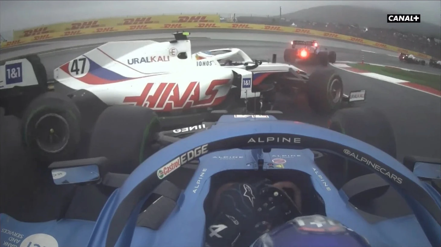 На старте Мик пропустил Джовинацци, а затем опередил Рассела и Алонсо (которого развернул Пьер Гасли в первом повороте). На мокрой трассе Шуми едва не потерял болид, что позволило Кими Райкконену выйти вперед. А в конце первого круга немца атаковал и прошел Джордж Рассел. Но на этом трудности не закончились…