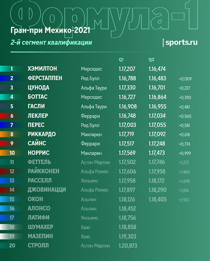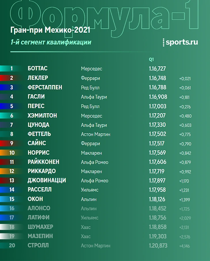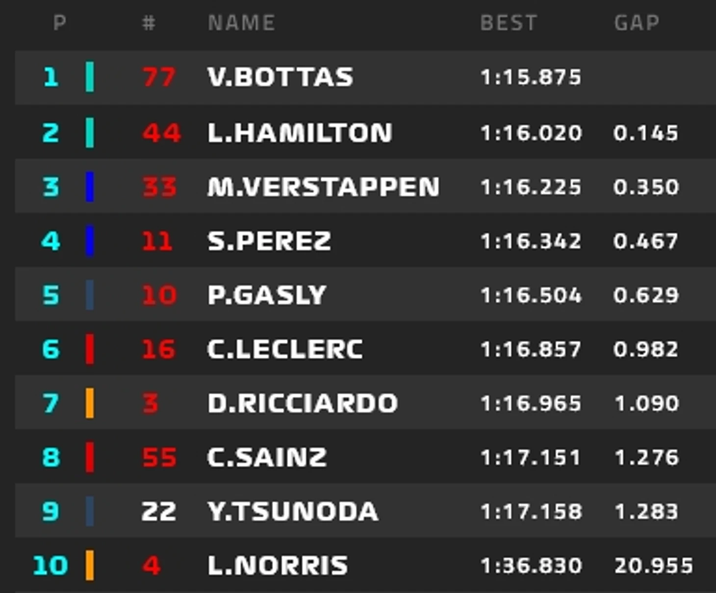 Ферстаппен – 1.16,788, Перес +0,3, Боттас +0,7, Хэмилтон +0,7.