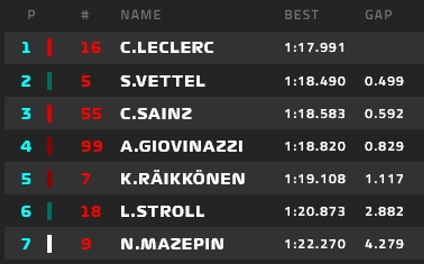По итогам второй части сессии выбыли: Феттель, Райкконен, Расселл, Джовинацци и Окон.
