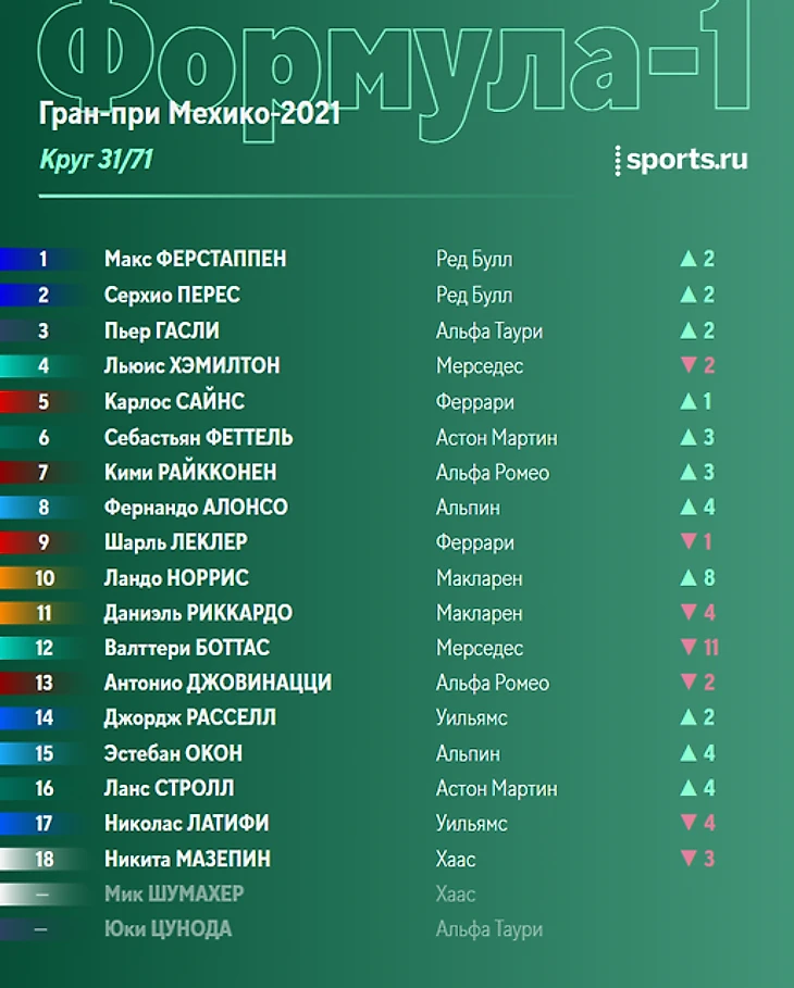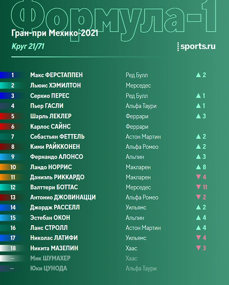 Расселл, что довольно предсказуемо, продолжает терять позиции. Все-таки в условиях гонки «Уильямс» пока не готов бороться в средней группе. Алонсо обогнал Джорджа, который в результате выпал из топ-10.