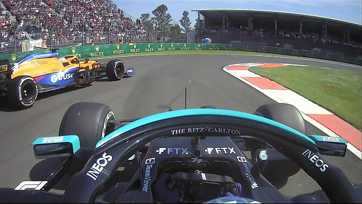 Хэмилтону также очень сильно мешает Норрис, который едет впереди. Ландо является круговым, но Хэмилтон просто не может подъехать достаточно близко, чтобы гонщику «Макларену» начали показывать синие флаги!