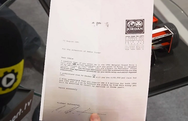 Ключевой момент письма – «I will sign A driver agreement». Самое важное здесь — что слово «The» в конечном варианте письма заменили на «а» – и как раз на это и упирал менеджмент Шумахера. С такой формулировкой они могли подписать абсолютно любое соглашение с «Джорданом» – например, о посещении завода в Сильверстоуне и ланче с Эдди. Потому английский суд и счел Михаэля свободными в заключении сделки с «Бенеттоном».