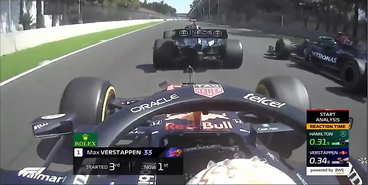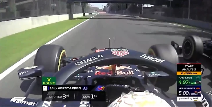 Зачем же Валттери это делал? Кажется, он не увидел в Ферстаппене реального соперника в схватке за лидерство на первых метрах, и потому решил сперва оттеснить Льюиса на менее выгодную траекторию (не сработало, ага). Скорее всего, №77 потом планировал-таки спокойно сдвинуться на внешнюю – но упустил момент: Макс моментально ухватил шанс вырулить влево. Именно потому и опередил «Мерседесы» даже после проигранного срыва с места – Льюис оказался на 0,03 секунды быстрее и по времени реакции, и по скорости достижения 200 км/ч (видно по замерам на скринах – 0,31 с против 0,34 с по срыву и 4,97 с против 5,00 с по разгону).