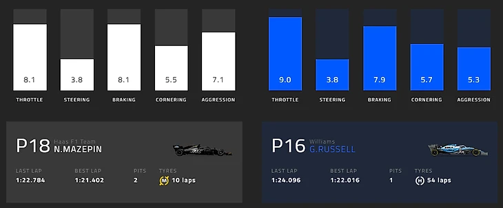 Никита Мазепин проводит неудачный дебютный сезон в «Формуле-1» не только в смысле результатов, но и работы с машиной: у русского пилота «Хааса» постоянно возникают проблемы с шинами и управляемостью. Автоматическая оценка пилотажа по телеметрии на официальном сайте постоянно и безапеляционно ставила его на последнее место во всех завершенных гонках – и временами даже с отставанием в полбалла от ближайшего конкурента.